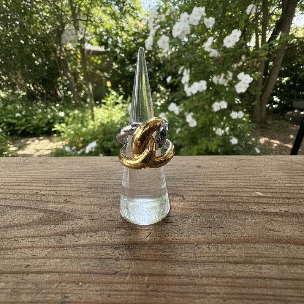 Una pieza que celebra la armonía de los contrastes. Esta sortija presenta un diseño de eslabones entrelazados en tonos oro y plata, creando un efecto visual dinámico y sofisticado que simboliza la unión y la fuerza.