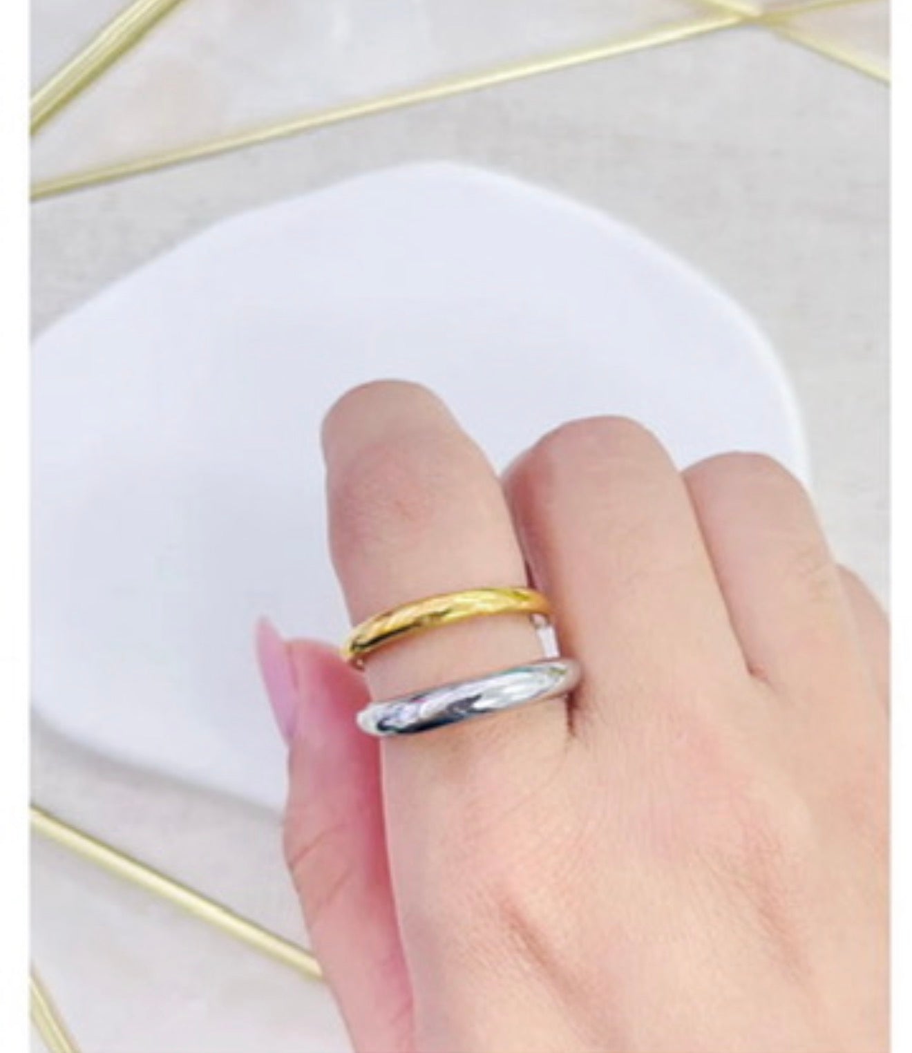 La belleza de lo simple se une en este dúo dinámico. Este set incluye dos anillos de banda delgada con un acabado redondeado y pulido tipo espejo, diseñados para ser usados juntos o por separado. La combinación de tonos oro y plata ofrece una versatilidad moderna, permitiéndote mezclar metales con total confianza.